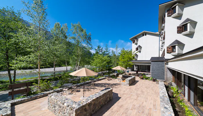 河童橋の喧騒から少し離れた、静かな梓川の河畔に立つ「上高地ルミエスタホテル」。信州や世界各地のワインとともにいただく本格フレンチや、大浴場や客室などホテル内すべてのお風呂に引かれた上高地では珍しい天然温泉が楽しめるリゾートホテルです。