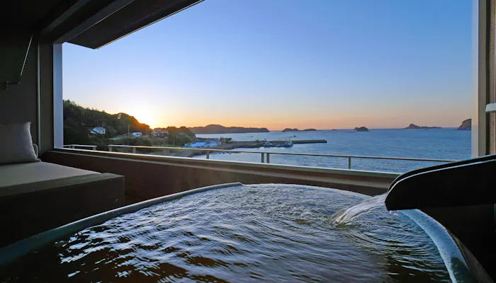 “神の島”と呼ばれる壱岐島で、無二の離島リゾート体験ができる「壱岐リトリート 海里村上 by 温故知新」。2020年6月にリブランドオープンし、全12室のオーシャンビュー客室に、黄金色の自家源泉を掛け流しで楽しめる客室露天風呂が備わりました。
