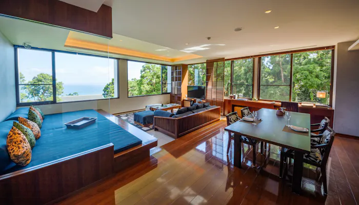 スイートタイプとヴィラタイプ合わせて29室の客室は、アジアンテイストのインテリアが映えるラグジュアリー空間。スイートタイプは、屈指のオーシャンビューが魅力の「サンカラスイート オーシャンビュー・半露天風呂付・本館」、ヴィラタイプでは、海を望むウッドデッキが備わる「ヴィラスイート オーシャンビュー」がおすすめです。ただ景色を眺め、何もしない優雅な時間を存分に味わって。
