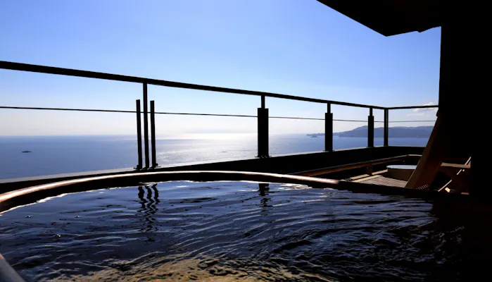 熱海市網代の高台に立つ「熱海 さんが」は、眼下に相模湾と熱海の奥座敷を望む温泉宿。究極のおもてなしにこだわり、宿泊できるのは大人だけ。7室ある客室全てにバルコニーと露天風呂を備え、圧巻のオーシャンビューを目の前に熱海の名湯を独り占めすることができます。