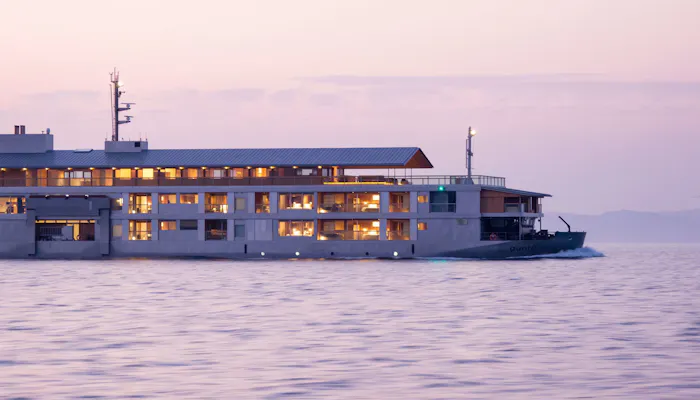 「せとうちの海に浮かぶ、ちいさな宿」をコンセプトに、美しい瀬戸内海を旅する豪華客船「ガンツウ」。19室の客室は、全て海面から距離が近いテラス付きのスイートルームです。大きな窓から暖かな光が注ぎ込み、部屋のどこにいても瀬戸内の温もりを間近に感じられます。