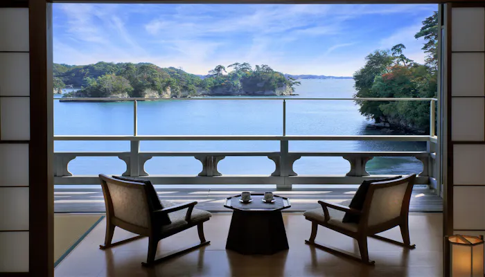 街の喧騒から離れた「松庵」は、約3,000坪の敷地内にわずか11室の小さな一軒宿。海に突き出た松島の岬に佇みます。お部屋に入るとまず目に飛び込んでくるのは、手の届きそうな距離にある松島の景色。松風を感じながら絶景に浸る、静寂のプライベートタイムを満喫できます。館内には「さろん くら」や「松島文庫」などおすすめスポットがたくさん。思い思いの過ごし方で、自由自在に滞在を楽しんで。