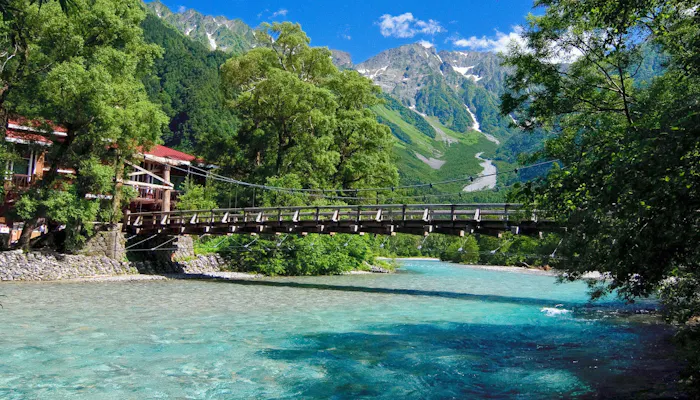 国の文化財に指定されている「上高地」は、飛騨山脈の南に位置する標高1,500メートルの山岳リゾートです。清冽な梓川に架かる上高地のシンボル「河童橋」は、絶好のビュースポット。橋の上からは雄々しくそびえる穂高連峰や岳沢などの山々を眺めることができます。