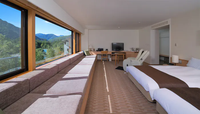 河童橋の喧騒から少し離れた、梓川の河畔に立つ「上高地ルミエスタホテル」。信州や世界各地のワインとともにいただく本格フレンチや、ホテル内すべてのお風呂に引かれた天然温泉が楽しめるリゾートホテルです。映画のスクリーンのようなパノラマビューが広がる「プレミアムシアターツインルーム」は、上高地で最も開放的な客室。双眼鏡もあるので天体観測をすることも。雄大な上高地の自然と煌めく星空を存分に満喫しましょう。