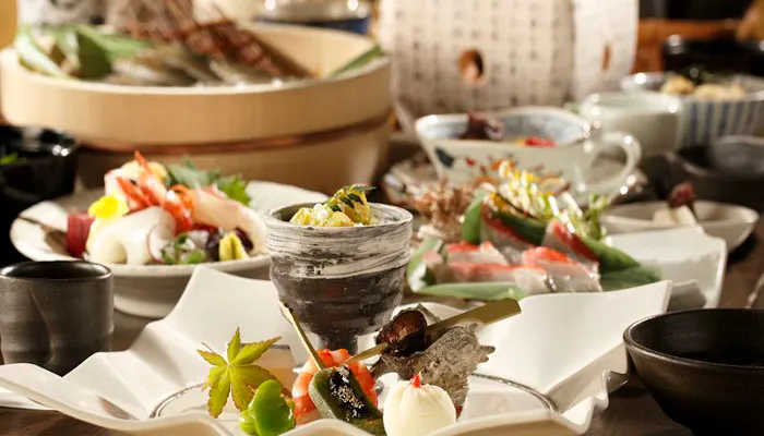 夕食は“美食オールインクルーシブ”をテーマに、熊野ブランド美熊野牛、岩清水豚、伊勢海老、鮑など、地元の食材や旬の幸を和会席でいただけます。もちろんお食事の飲み物も料金に含まれています。