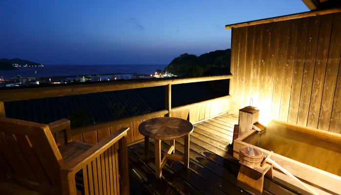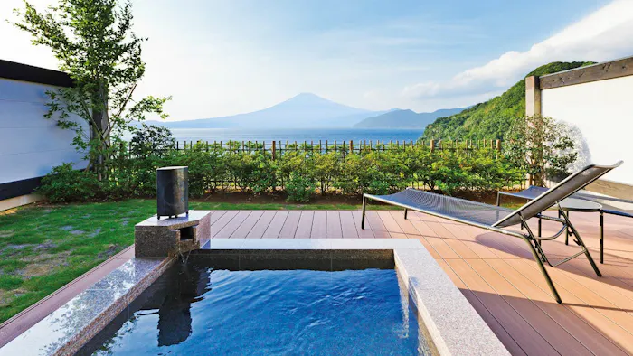 お部屋のテラスには、源泉掛け流しの温泉で満たされた露天風呂が。眼下に広がる駿河湾を一望しながらの湯浴みを家族みんなで楽しみましょう。