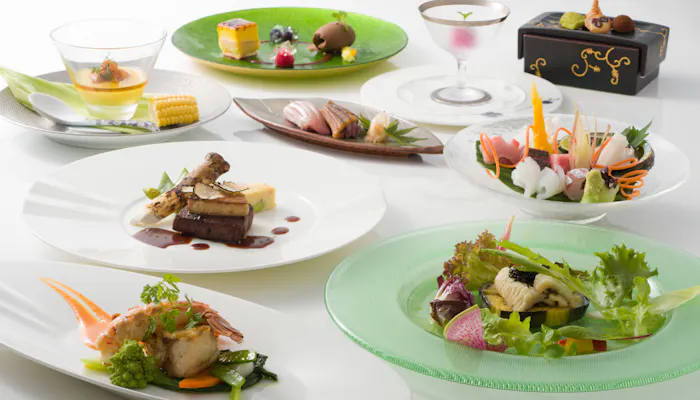 お食事は、駿河湾の海の幸や伊豆の朝摘み野菜をふんだんに使ったプレミアムフレンチ懐石料理。オールインクルーシブのプランでは、お食事に合うワインなどの飲み物を気にせずお願いしてみましょう。もちろんお部屋の冷蔵庫内にあるお酒や炭酸飲料、ジュースなども無料です。その他にもエステ・鍼灸・あん摩マッサージの中から1コースを選んで60分間受けられるオールインクルーシブプランもあり。心も身体も癒されてみては。