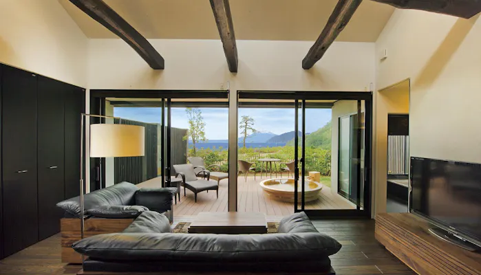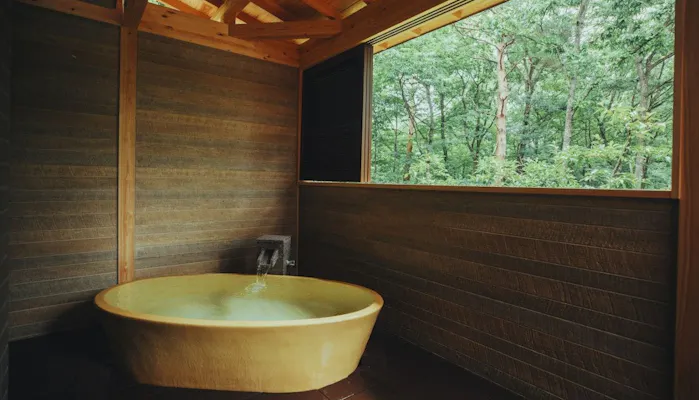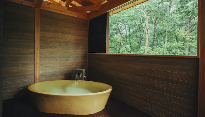 すべての客室から那須の自然の緑を望むことができ、インテリアはホッとするナチュラルな雰囲気で統一されています。スイートタイプのお部屋には温泉露天風呂が備わり、高原の季節を肌で感じながらの湯浴みが叶います。