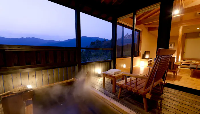 三重県、伊勢から熊野へと続く路に立つ「世界遺産リゾート 熊野倶楽部」。美しい熊野の自然を感じられるように設計された客室は、全室スイートとなっています。特に「離れ 露天風呂付スイート<新月庵>」と「離れ 露天風呂付ロイヤルスイート<満月庵>」では、広々とした熊野杉製の半露天風呂での湯浴みとともに、自然を堪能できます。