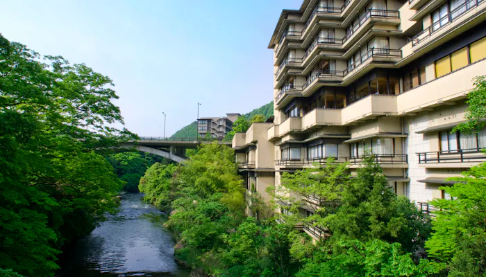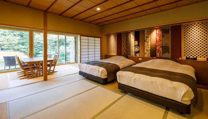 名勝・鶴仙渓の上流、総檜造りが見事なこおろぎ橋の袂に佇む「みやこわすれの宿 こおろぎ楼」。渓谷美を眺めながら寛げる全7室の客室は、夕朝ともにお部屋食。2室限定の「離れ」には、客室露天風呂と掘り炬燵式のダイニングが備わります。