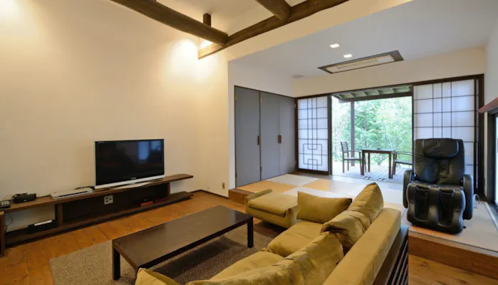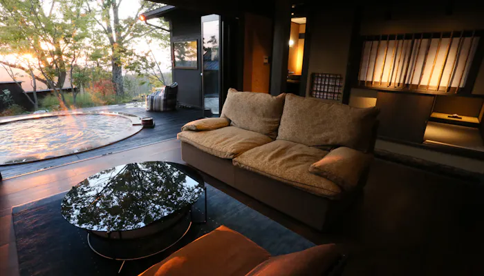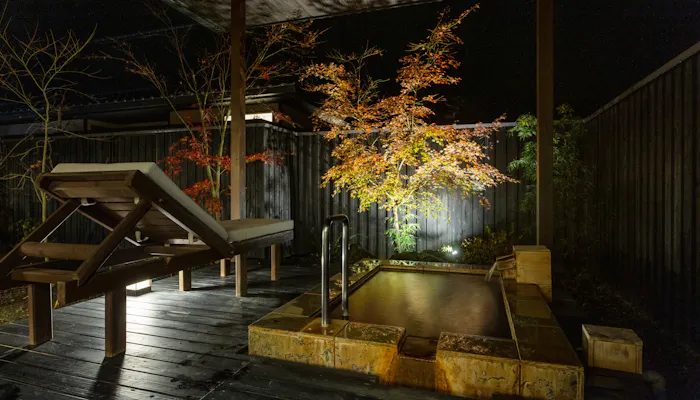 最もこぢんまりとしたお部屋でも、広さはゆったりと60平米以上。すべてのお部屋に源泉掛け流しの露天風呂、喫煙スペースも兼ねたウッドデッキが備わり、気の向くままの滞在が叶います。お食事付きのプランでは身体の芯から温まる季節の味覚を堪能でき、湯治と相まって日々の疲れもリフレッシュされるでしょう。