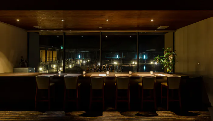 専用の個室ダイニングでいただくお食事は、厳選された鹿児島県内産の旬食材を中心とした本格的な懐石料理。すべての品が化学調味料不使用なのも宿のこだわりです。ライトアップされた水盤を眺めながら焼酎やウイスキーがいただけるバーカウンターも用意され、食後の余韻も愉しめるでしょう。