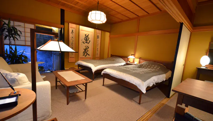 由布岳の麓に約1万坪の敷地を有する「亀の井別荘」。大正10年の創業以来、多くの要人をもてなしながら、この地の変わらぬ静けさを見守ってきました。本館の客室は、ホテルタイプの快適に過ごせるお部屋。なかでも「奥由布」には温泉の内風呂に加え、露天風呂も備わります。