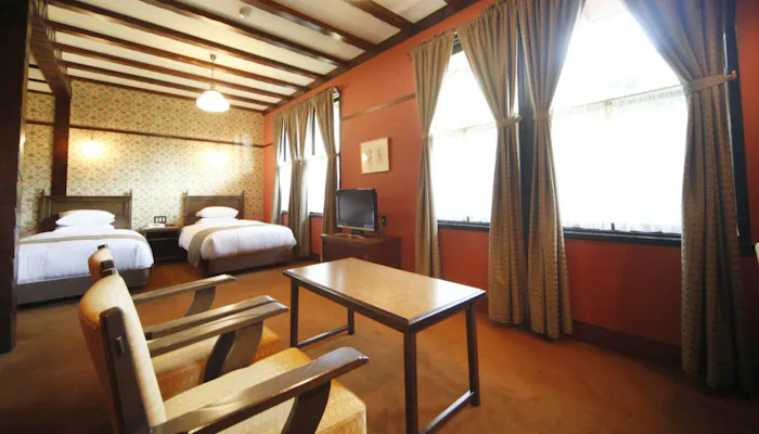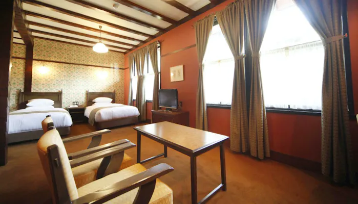 当時の趣を残すスイス・シャレー風の風格ある建築は、到着した瞬間から気分を盛り上げてくれるはず。壁紙やデザインの異なるゲストルームは、異国情緒が漂うレトロな設えになっています。お食事をいただくダイニングルームもまた、「雲仙観光ホテル」を象徴する空間。こだわりのフレンチコースを愉しむことができます。