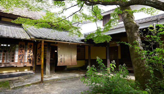 福岡県・久留米市の筑後平野に佇む「天然田園温泉 ふかほり邸」は、江戸時代より続く旧家「深堀邸」がもととなっている宿。約4,000坪の敷地には5つの離れが配され、設えには旧家から受け継がれた梁や柱、土壁などが使用されています。