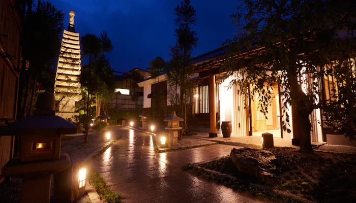 レストラン「螢火園」でいただくお食事は、地元ならではの食材を使った会席料理。地酒やワインとの相性も抜群なのだそう。甘味や軽食が愉しめる「茶房 天井棧敷」や、ライトアップされた庭園を眺めながらお酒がいただける「BAR 山猫」など、充実した館内施設が利用できるのも一人旅には嬉しいポイントです。