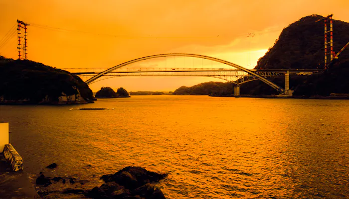九州本土の三角を起点に、天草諸島の島々を繋ぐ5つの橋「天草五橋」。「天草パールライン」の名前でも親しまれる約15kmの道から眺める夕陽は、「日本の夕陽百選」にも選ばれる美しさです。
