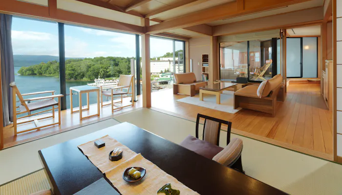 お部屋の眺望は、湖・森・街側 と向きによって異なりますが、全25室が温泉露天風呂付のスイートルーム。遮るもののないレイクビューを楽しみたいのなら、湖側の「【露天風呂付・湖側】特別室 天の座スイート」「【露天風呂付・湖側】湖の座スイート」がおすすめです。