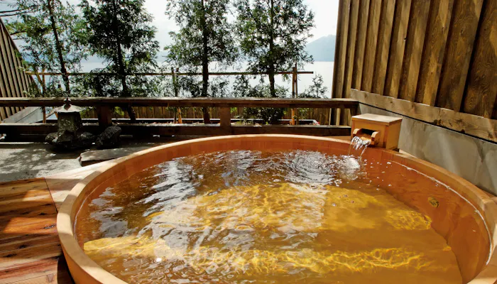 全室天然温泉付に加え 、さらに館内には石造りの「翡翠の湯」、檜造りの「瑠璃の湯」 2つの貸切露天風呂が備わるのも嬉しいポイント。どちらの湯船からも、支笏湖が見えるのは言うまでもありません。朝から晩まで、刻々と変化する幻想的な風景を堪能しましょう。