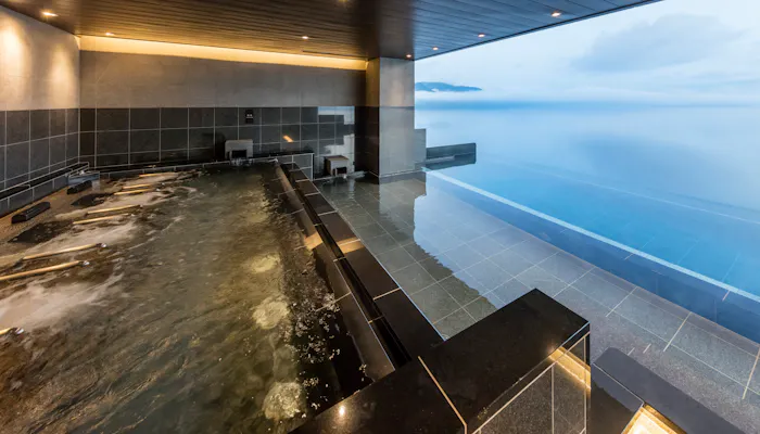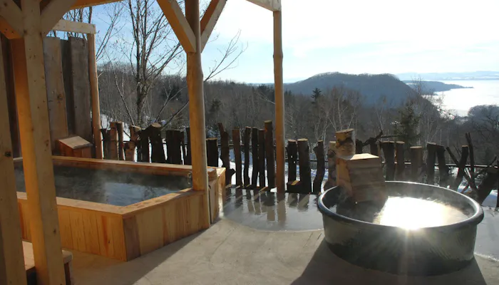 湯船を3段の棚田状に広げた露天風呂は、宿の立地を活かし、湖に向かって空中に突き出した造りに。湯船に浸かれば、洞爺湖の湖面と空がシームレスに繋がり、まるで 浮かぶような感覚に陥ることでしょう。