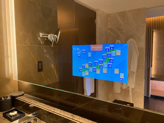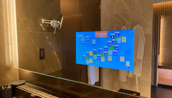 電源を入れるとこんな感じでテレビが映ります。朝の身支度をしながら、天気予報やニュースをチェックすることも……!すごい、感動。