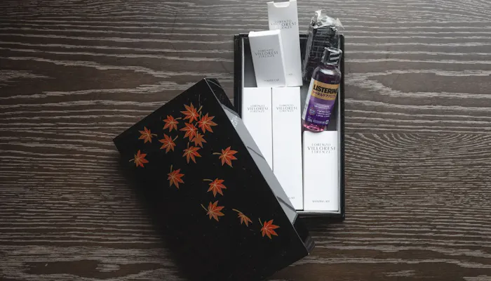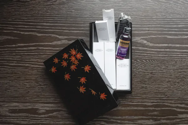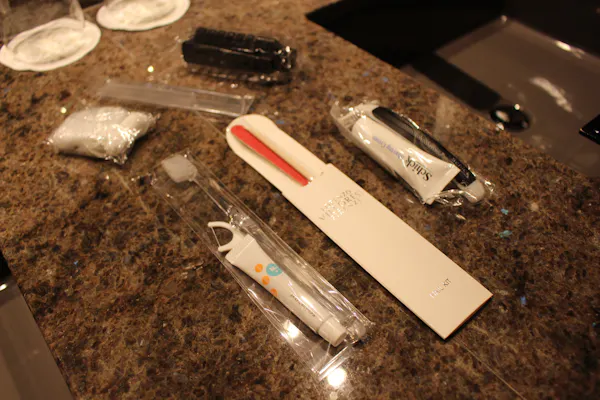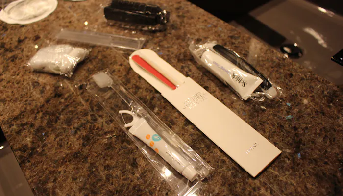 漆の箱に入ったアメニティも充実していて、歯ブラシには糸ようじまでセット。櫛とブラシの2種類があり、爪磨きまでありました。