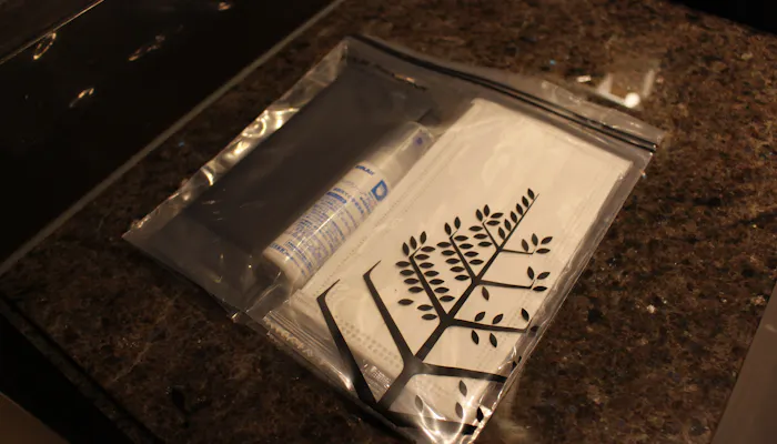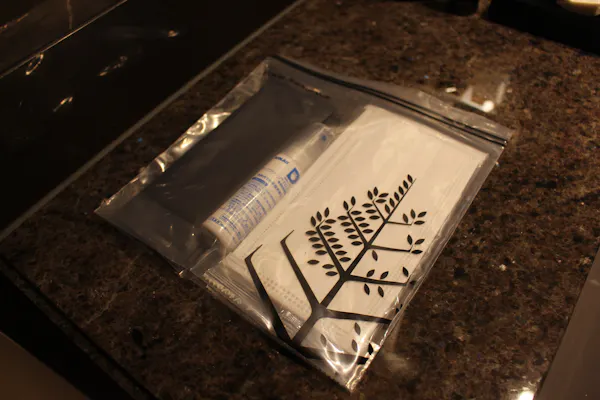 さらにマスクが2枚、ウェットおしぼり、ハンドアルコールスプレーまで。チャック付きポリ袋に収納されているので、このまま鞄に入れて外出もできます。いたれりつくせりのサービスに、部屋を一歩も出ないうちから胸がいっぱい!