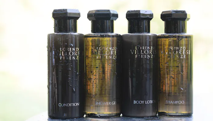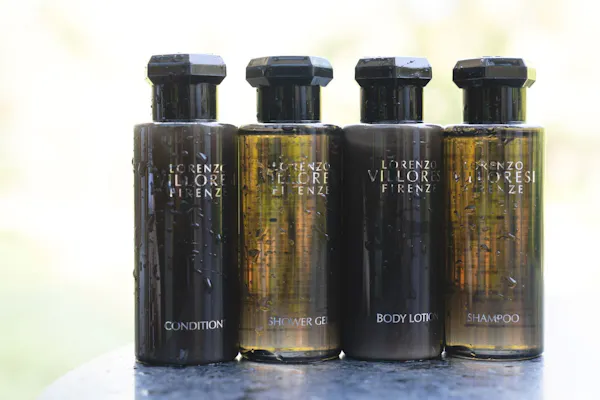 バスタブにはフィレンツェの香水ブランド「ロレンツォ・ヴィロレッツィ」のバスアメニティ:シャンプー、コンディショナー、ボディソープ、ボディローション、石鹸、スポンジ、そしてオリジナルの入浴剤も。