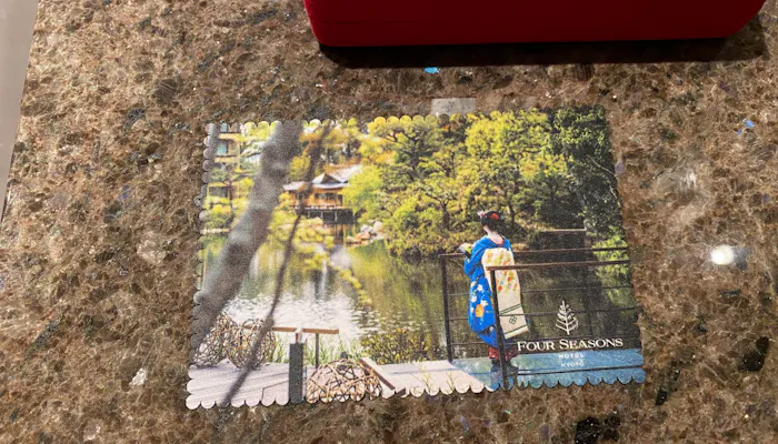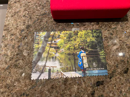 さて、部屋を空けている間、お掃除の方が入ってくれたのですが、洗面所にメガネケースを置いていたら、部屋に帰ってきたときにメガネ拭きが置いてあることに気が付きました。しかも舞妓さんが積翠園に佇んでいるデザイン&「フォーシーズンズホテル京都」のネーム入り。