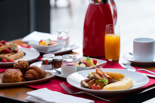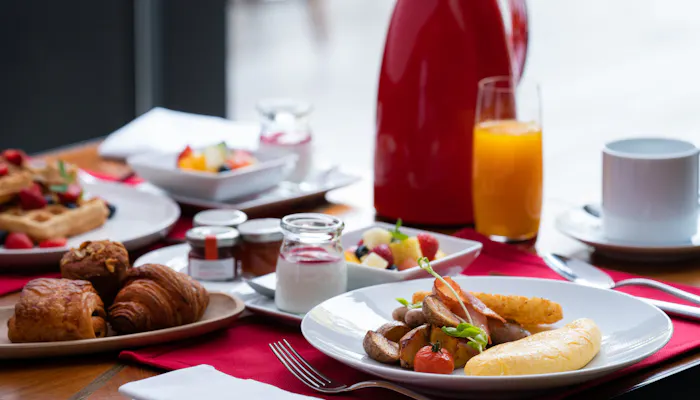 モーニングの「アメリカンブレックファースト」はメインの一品が、オムレツやエッグベネディクト、ワッフルなどから選べます。今回私が選んだのは「サラダパスカード」。これはフランスの星付きレストランで腕を磨いた古賀料理長が、フランス時代に食べた郷土料理を再現した一皿で、ほんのり甘くもっちりとした生地にたっぷりのサラダがのっています。ドレッシングは、コブサラダドレッシングと柑橘系のさっぱりドレッシングをお好みで。チーズやチキンもトッピングでき、カスタマイズできる楽しみがありました。