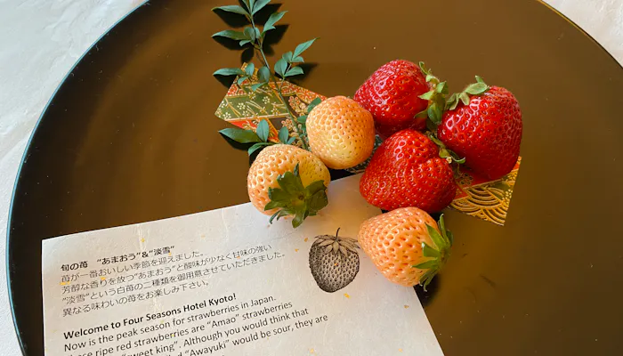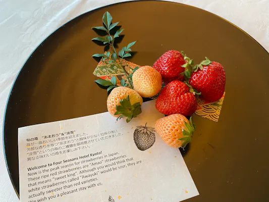 各部屋にはフレッシュなウェルカムフルーツが用意されています。この日は、今が旬の「あまおう」と「淡雪」という2種の苺。珍しい白苺にテンションは上がり、気分はもうプリティーウーマン。シャンパンでもオーダーしたい気持ちです。
