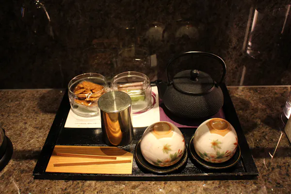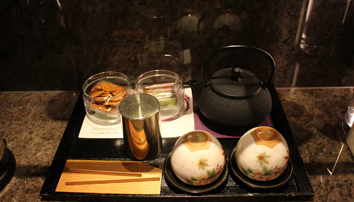 ルームアメニティとして用意してあったのは、清水焼の湯飲みと茶葉。茶筒も日本で一番古い歴史を持つ老舗「開化堂」のもので、置いてあるアイテムからも、さりげなく京都らしさが感じられます。