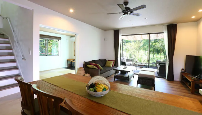 バリ島に特注した家具やレリーフでコーディネートされたヴィラは、リゾートのムードが漂うお洒落な空間。リビングから続く広々としたテラスは、ガーデンソファでうたた寝をしたり、森林浴をして寛いだり、思い思いに楽しめる特等席です。