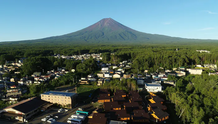 富士山麓の町・富士吉田にある「富士山リゾートログハウスふようの宿」は、国産杉を使用したリゾートログハウス。街中にありながら、敷地内には雄大な富士山を背景にログハウスが建ち並び、非日常感を味わえるとクチコミでも好評です。
