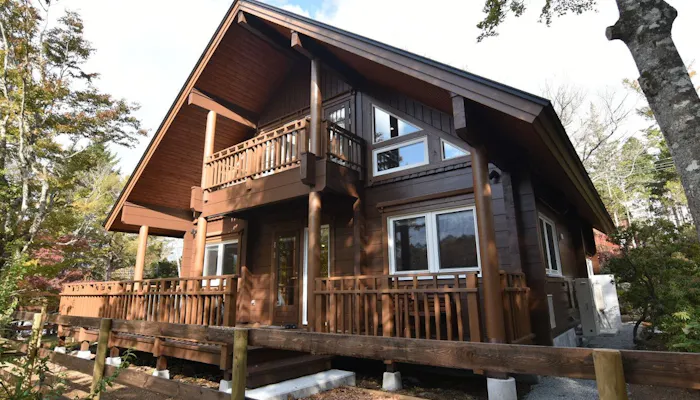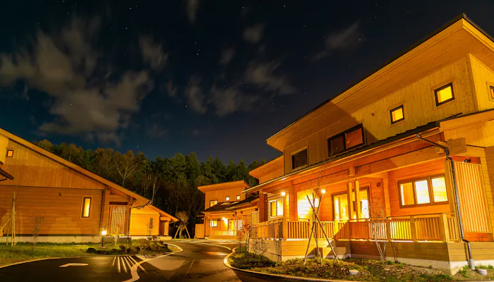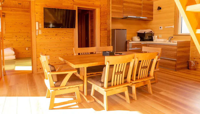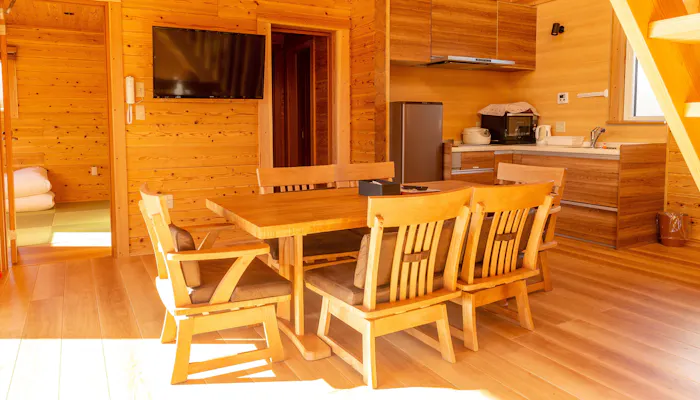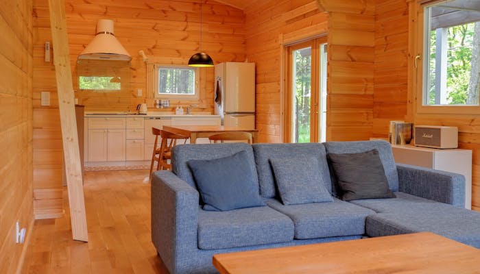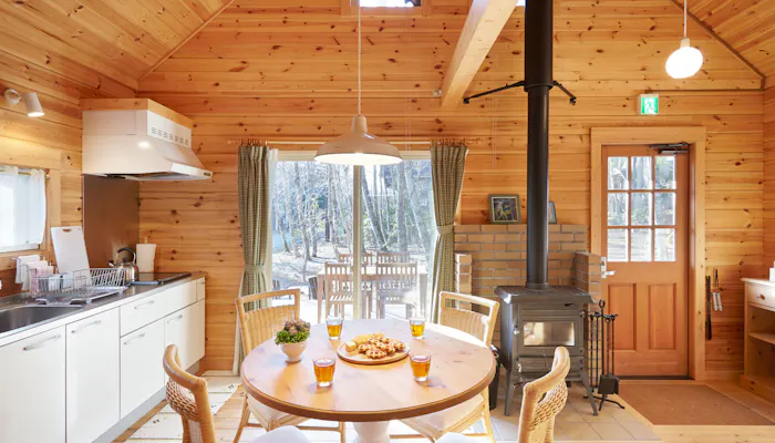 建物は、1LDKにロフトを備えた「ログハウス」と、2階建て3LDKの「グランドヴィラ」の2タイプ。木の温もり溢れる空間に、テラスやウッドデッキ、薪ストーブなど、憧れの設備が詰まっています。