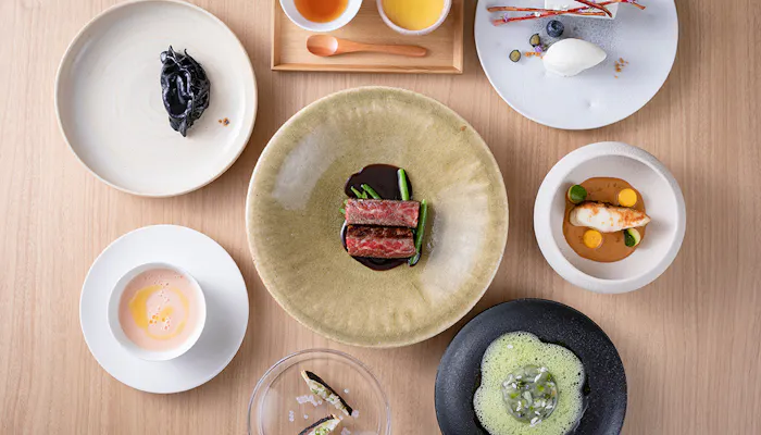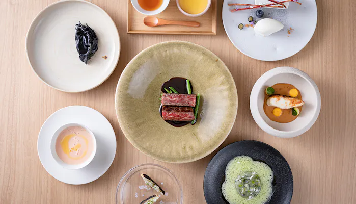 牡蠣、鯛、シラスなど新鮮な海産物から、広島和牛、オリーブ、豊富な柑橘類に至るまで、広島には優れた食材がたくさん。夕食は、その自慢の食材を用いた全7品ほどのコースディナーです。フランスで修業を重ねた小竹隼也シェフの技が光る和フレンチは、目も舌も喜ばせてくれます。