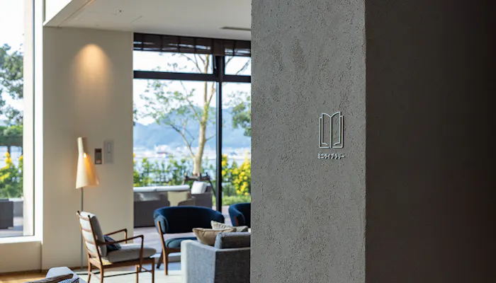 ロビー横のフリードリンクコーナーや、呉で生産されているセイラー万年筆のインクが並ぶミニライブラリー、湯上りに楽しみたいテラスなど、館内設備も充実。
