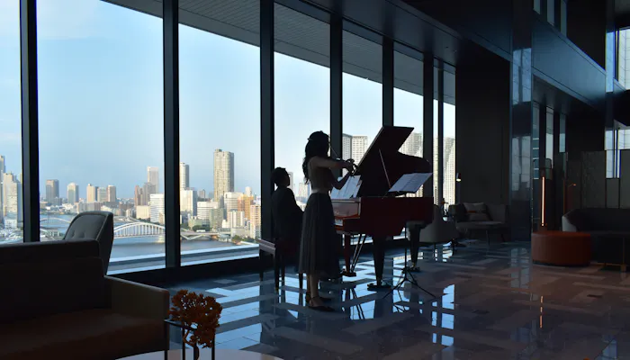 ちなみにロビーフロアでは、様々なアーティストの生演奏やパフォーマンスを楽しめる無料のイベント「ショーケース」を毎日開催。この日は、ピアノとバイオリンの生演奏。美しい景色とともに素敵な演奏を堪能させていただきました。