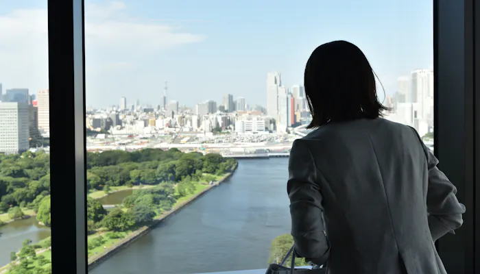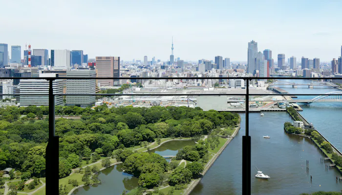 大きな窓からは、浜離宮恩賜庭園や隅田川などウォーターフロントの景色を一望。正面には視界を遮る建物は何もないので、窓辺で景色を眺めていると、まるで水上に浮かんでいるかのよう。