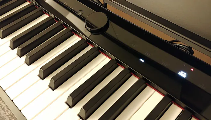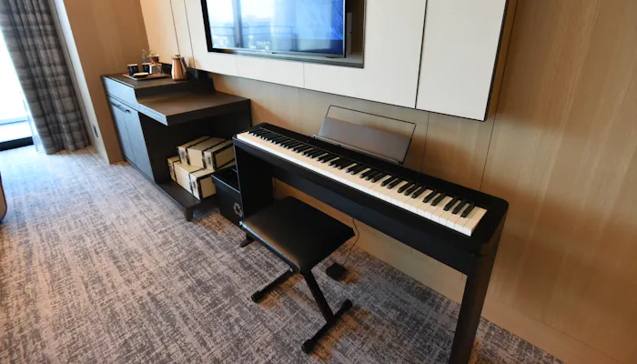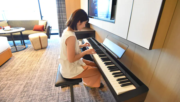 室内で一際存在感を放つのは、スタイリッシュなデジタルピアノ。五感を魅了する体験ができるコンテンツのひとつとして、全客室にCASIOのデジタルピアノ「Privia(プリヴィア)」が設置されています。