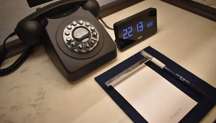 ベッドサイドには、マットな質感がお洒落な黒電話。見た目はダイヤル式ですが実はプッシュ式と、遊び心が感じられるデザインです。その隣には、ミッドナイトブルーのインクの筆ペンが。フェルトの下敷きや文鎮は、「お習字セット」のようなデザインで、懐かしい気持ちに。
