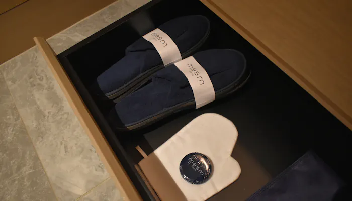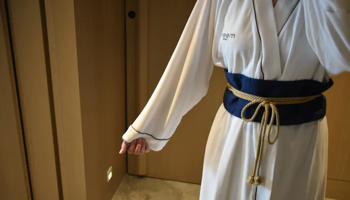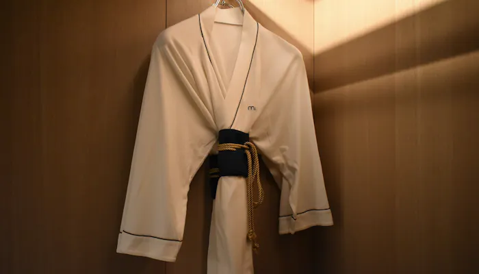 ベッドのヘッドボードに使われている和紐は、着物の帯留めからの着想。雪駄風の室内履き、「KIMONOローブ」という着物から着想を得たデザインのバスローブ兼パジャマなど、さりげなく和を感じられる小物もこだわりのひとつです。