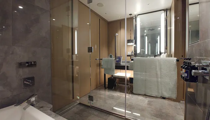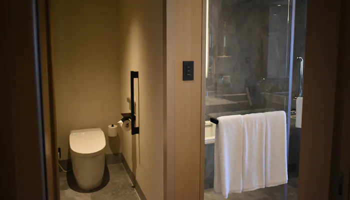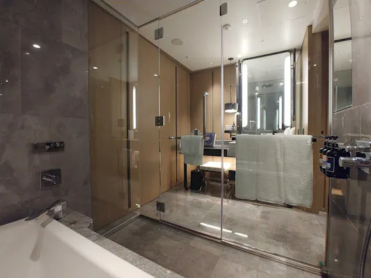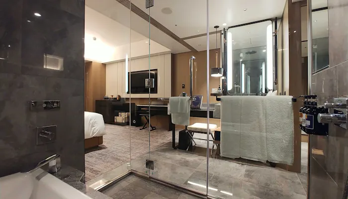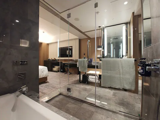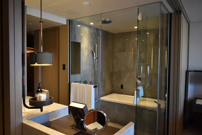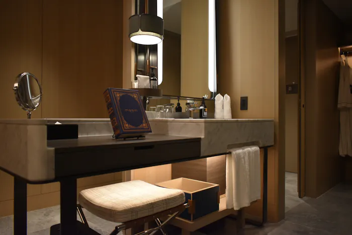 「チャプター2」は広さ43~44平米(バルコニーの面積を除く)。私が宿泊させていただいたお部屋はこのように、半島型の洗面台を中心にぐるりと一周できる造りになっていました。