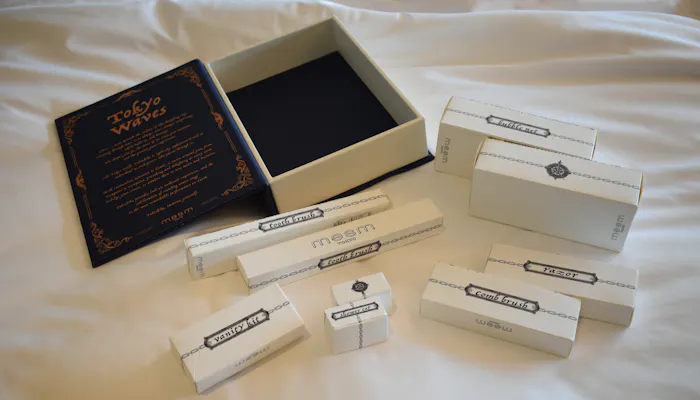 パズルのように詰められた小さな箱の正体は、歯ブラシやバブルネットなどのアメニティ。あまりの可愛さに、中身を取り出した後の箱を、ボックスに戻してしまうほどでした!