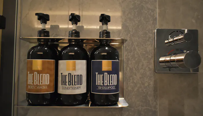 シャンプー等のバスアメニティは「BULK HOMME」プロデュースのホテルオリジナルです。香りは、男女ともに心地良く使うことができそうな、爽やかで優しい柑橘系。環境に配慮し、ガラス製のディスペンサータイプで設置されています。