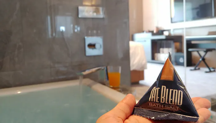 こちらはミネラルたっぷりのエプソムソルト。色はもちろんミッドナイトブルー。1袋入れただけで、爽やかな香りが浴室いっぱいに広がりました。