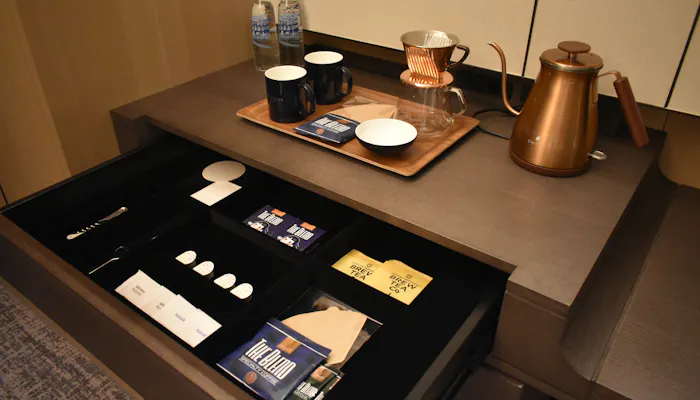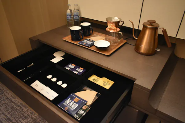 コーヒー、抹茶、ミルキー、冷蔵庫内のコールドドリンク(ミネラルウォーター、オレンジジュース、ビール)も全て、宿泊料金に含まれており、自由にいただくことができます。
