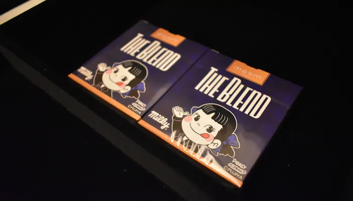 黒髪に青いリボン、メズム東京オリジナルのY’S BANG ON!のユニフォーム姿が大人っぽい印象のペコちゃんマークの箱は、もちろんお菓子のミルキー。「メズム東京」のためだけに作られた特別なパッケージです。