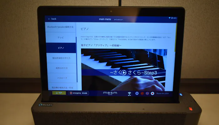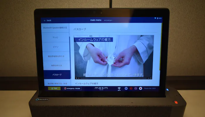 そんな方でも安心して使えるように、室内に設置されているタブレットで、コーヒーの淹れ方や抹茶の点て方、ピアノの弾き方、そして「KIMONOローブ」の帯の結び方までも丁寧に動画で紹介しています。
