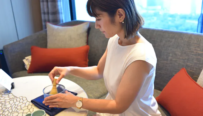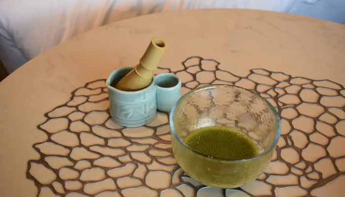 お茶は、京都の老舗「舞妓の茶本舗」の粉末の抹茶。茶碗と茶筅も用意されています。
